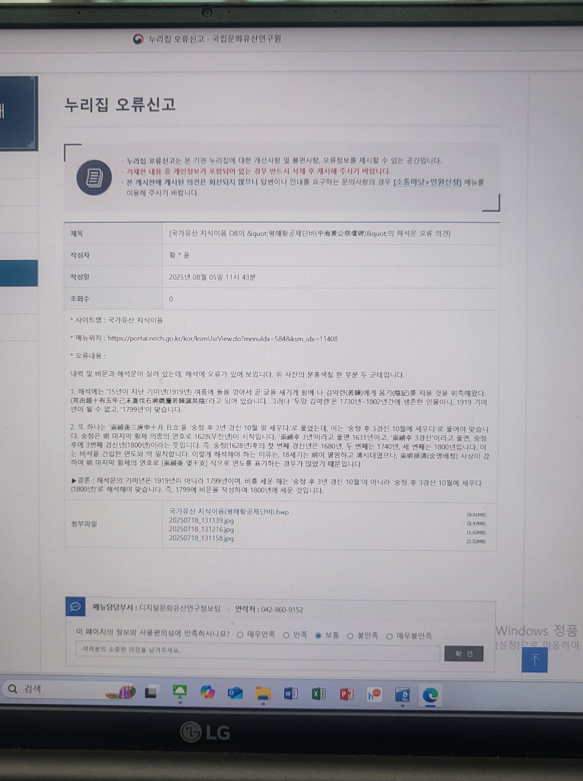 사진3 : 문화유산청 오류 신고내용(2025. 8. 5)