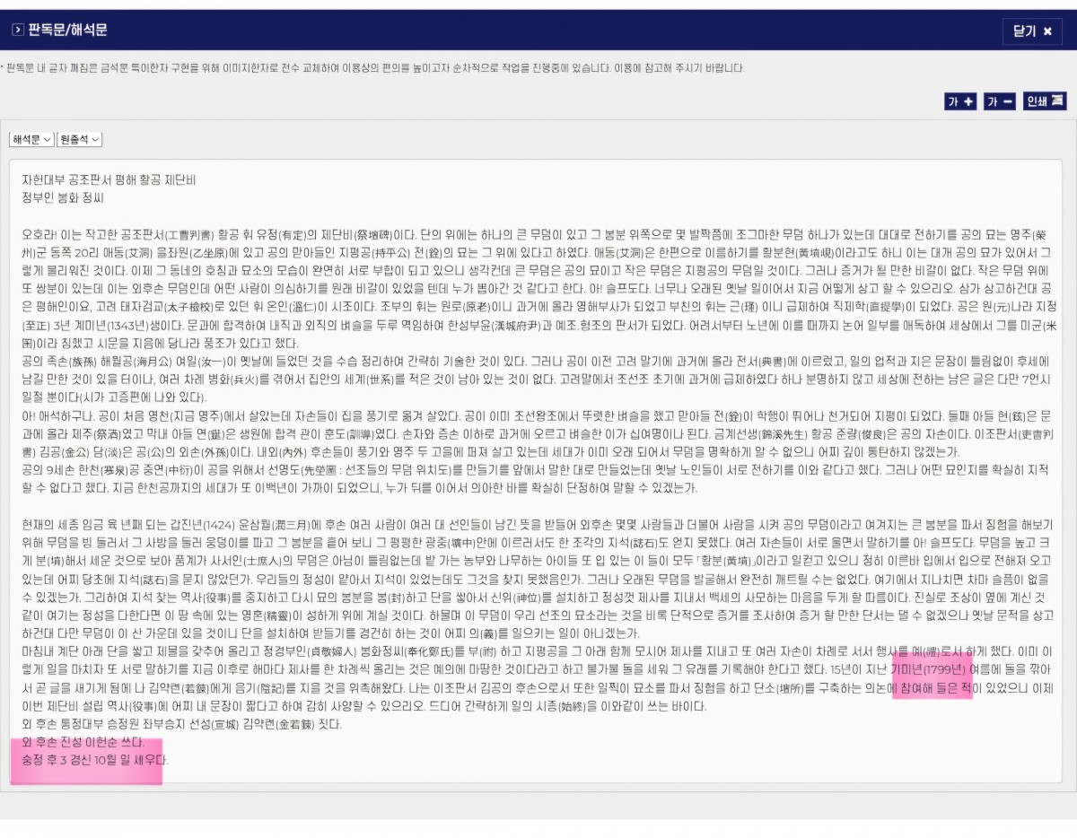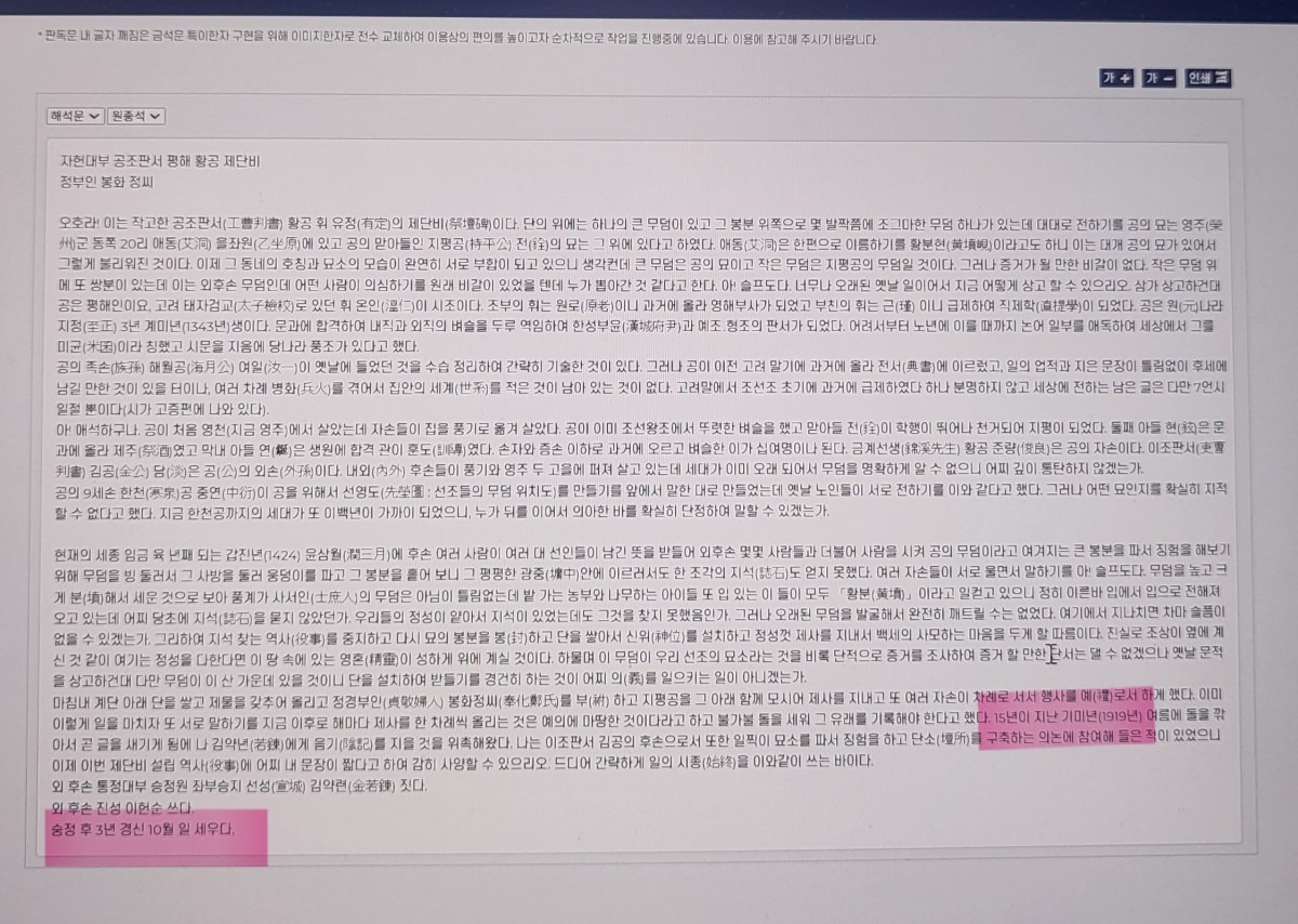 검교공 8세 공조판서公 황유정(黃有定)의 제단비가 ‘국가유산지식이음’ 사이트에 비문과 해석문이 등록되어 있는데, 해석에 오류가 있었습니다. 오류내용은 다음과 같았습니다.