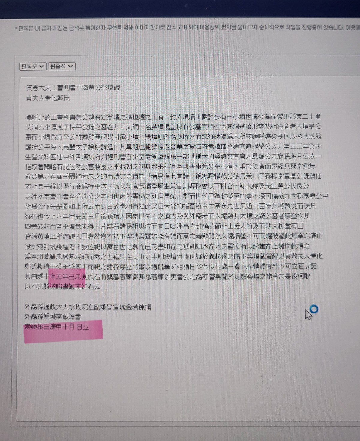‘평해황공제단비(平海黃公祭壇碑)’ 해석문 오류 수정(2025년 8월 5일)
